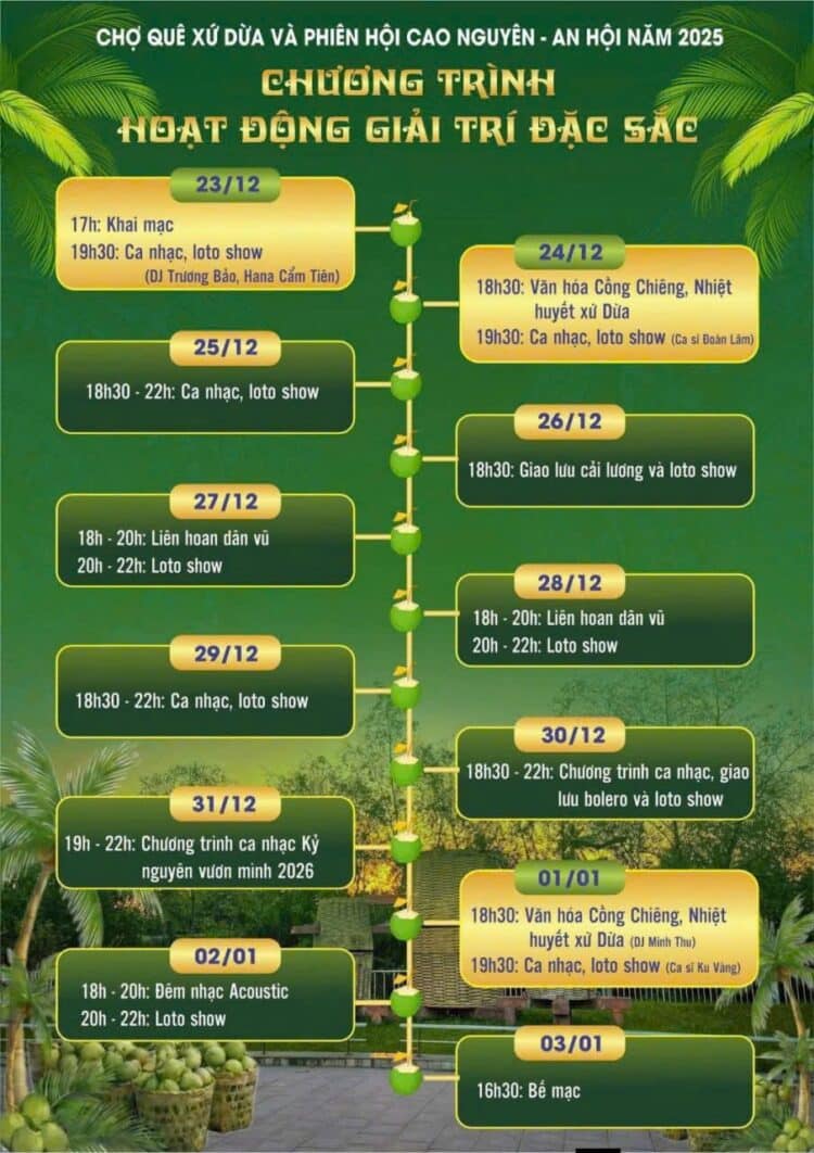 Sự kiện sẽ diễn ra chính thức từ ngày 23/12/2025 đến 03/01/2026, tại Công viên Cái Cối. Đây là hoạt động do Ủy ban nhân dân phường An Hội chủ trì, kết hợp với các đơn vị văn hóa nghệ thuật, doanh nghiệp và tổ chức xã hội nhằm tạo dựng một không gian giao lưu văn hóa vùng miền độc đáo, mới lạ và đầy màu sắc ngay giữa lòng đô thị. Sự kiện được kỳ vọng sẽ trở thành điểm nhấn văn hóa du lịch nổi bật của phường An Hội cuối năm 2025, mang đến cho người dân và du khách cơ hội trải nghiệm những nét đẹp truyền thống của Xứ Dừa miền Tây kết hợp cùng sắc màu đại ngàn của Cao nguyên hùng vĩ.