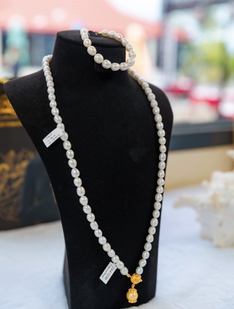 Nhiều du khách thích thú khi được “mãn nhãn” các sản phẩm ngọc trai do nghệ nhân kim hoàn quốc gia Hồ Thị Thanh Hương chế tác
