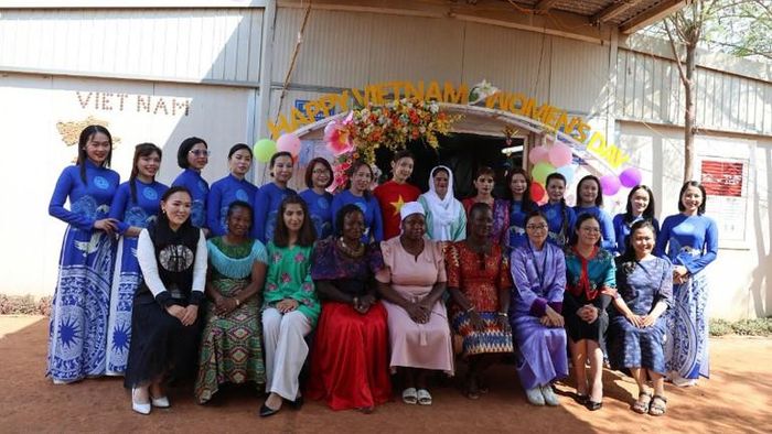Các nữ quân nhân Bệnh viện dã chiến cấp 2 số 7 tại Phái bộ gìn giữ hòa bình Liên hợp quốc ở Nam Sudan trong tà áo dài truyền thống, chào mừng Ngày Phụ nữ Việt Nam 20/10. (Ảnh: TIẾN PHÚC)
