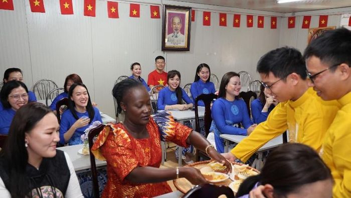 Các nam quân nhân của Bệnh viện dã chiến cấp 2 số 7 giới thiệu một số món ăn Việt tới các đại biểu nữtham gia chương trình. (Ảnh: TIẾN PHÚC)