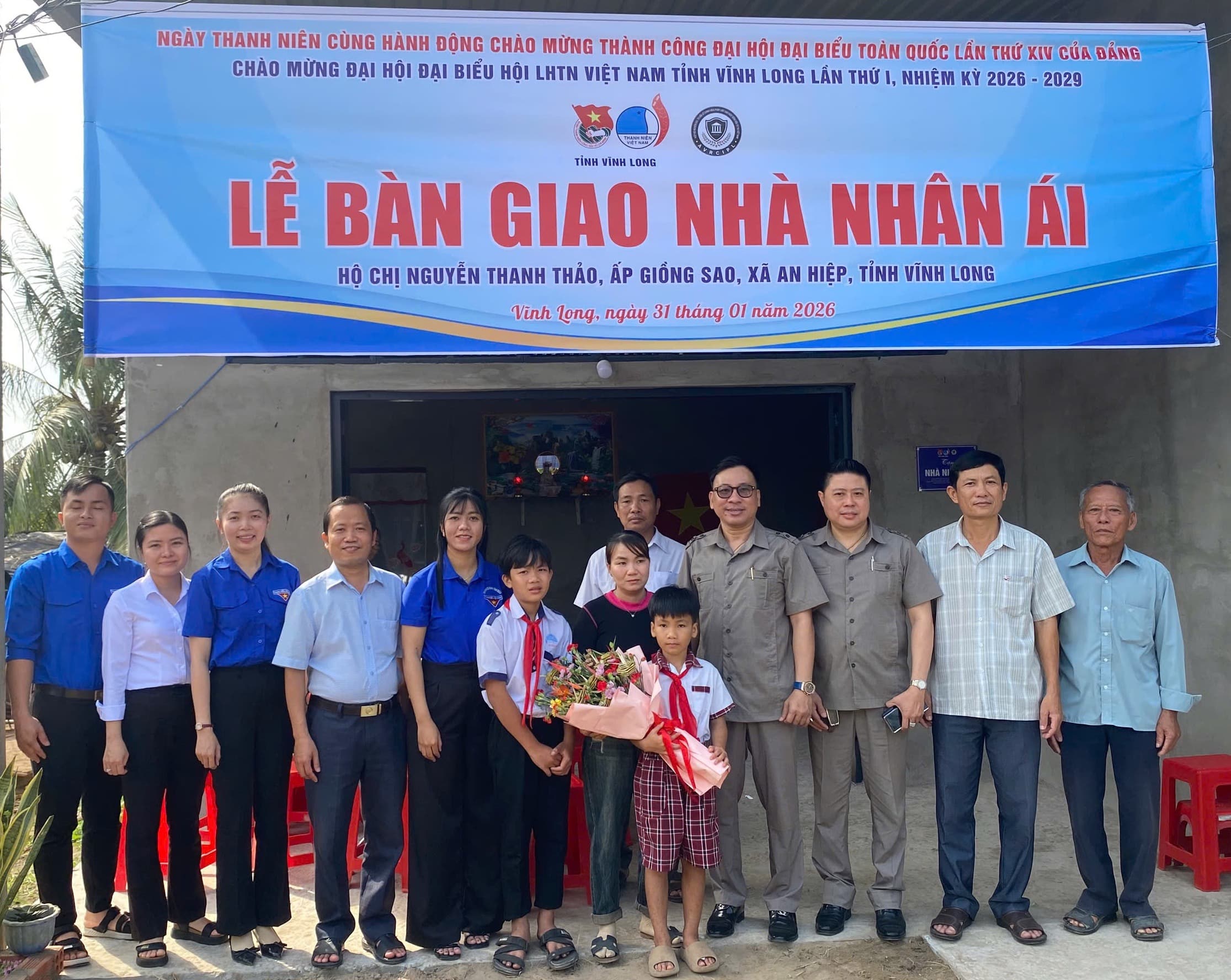 (VHCĐO) – Sáng ngày 31/01/2026, Ban Thường vụ Tỉnh đoàn, Ban Thư ký Ủy ban Hội LHTN Việt Nam tỉnh Vĩnh Long đã phối hợp Hiệp hội Phát triển văn hoá cộng đồng Việt Nam (VCCDA); Viện Nghiên cứu Thị trường – Truyền thông Quốc tế (IMRIC) và Viện Nghiên cứu Chính sách pháp luật&Kinh tế hội nhập (IRLIE) tổ chức Lễ bàn giao công trình Nhà nhân ái cho hộ gia đình chị Nguyễn Thanh Thảo – gia đình có hoàn cảnh khó khăn về nhà ở tại ấp Giồng Sao, xã An Hiệp, tỉnh Vĩnh Long. Công trình chào mừng thành công Đại hội Đại biểu toàn quốc lần thứ XIV của Đảng và chào mừng Đại hội Đại biểu Hội LHTN Việt Nam tỉnh Vĩnh Long lần thứ I, nhiệm kỳ 2026 – 2029.