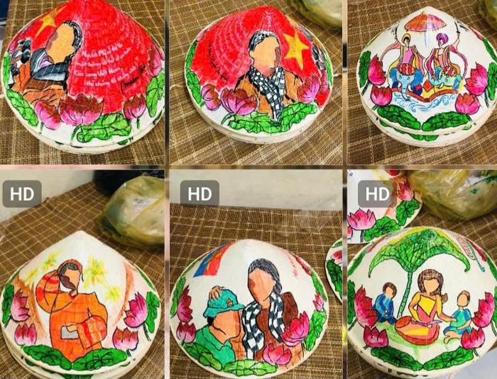 Trên mỗi chiếc nón lá, hình ảnh người phụ nữ Việt Nam duyên dáng, hay vẻ đẹp bình dị của làng quê An Giang, sắc vàng rực rỡ của những hoa sen, hoa phượng, cây lúa… được thể hiện tinh tế, đầy sáng tạo và cảm xúc.