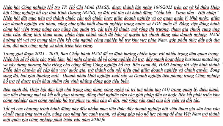 Dịp này, đã diễn ra lễ công bố Triển lãm – Diễn đàn về CNHT và Hội nghị kết nối cung cầu chuỗi cung ứng 2025, dự kiến được HASI phối hợp với các đơn vị, đối tác có liên quan tổ chức vào ngày 5-6/12/2025 tại TP. Hồ Chí Minh. Sự kiện được kỳ vọng trở thành điểm hẹn lớn cho cộng đồng doanh nghiệp Công nghiệp hỗ trợ Việt Nam và quốc tế, nơi các doanh nghiệp gặp gỡ, tìm kiếm cơ hội hợp tác, ký kết các thỏa thuận thương mại và mở rộng kết nối trong chuỗi giá trị toàn cầu.