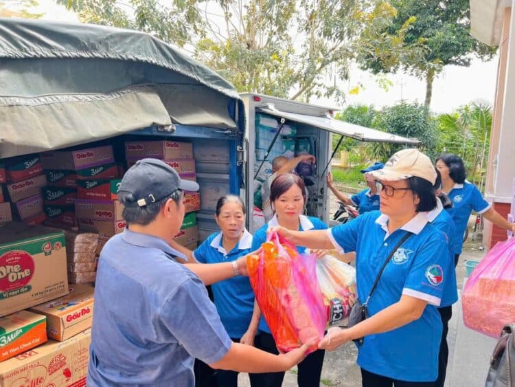 Bên ngoài sân, không khí càng khẩn trương hơn khi những chuyến xe tải chờ sẵn để nhận hàng cứu trợ. Các chị em phối hợp với lực lượng địa phương chuyền tay nhau từng thùng carton, từng bao gạo, bao quần áo, và các nhu yếu phẩm. Một hàng người nối dài, từng món quà được đưa lên xe bằng tất cả sự trân trọng và yêu thương. Khi tất cả hàng hóa đã được sắp xếp hoàn chỉnh và những chuyến xe đầu tiên lăn bánh, phía sau là ánh mắt dõi theo đầy hy vọng của các hội viên. Ánh mắt ấy chất chứa niềm tin và kỳ vọng rằng những phần quà tuy nhỏ bé nhưng trọn vẹn tình người sẽ tiếp thêm sức mạnh cho đồng bào miền Trung vượt qua khó khăn, sớm ổn định cuộc sống.
