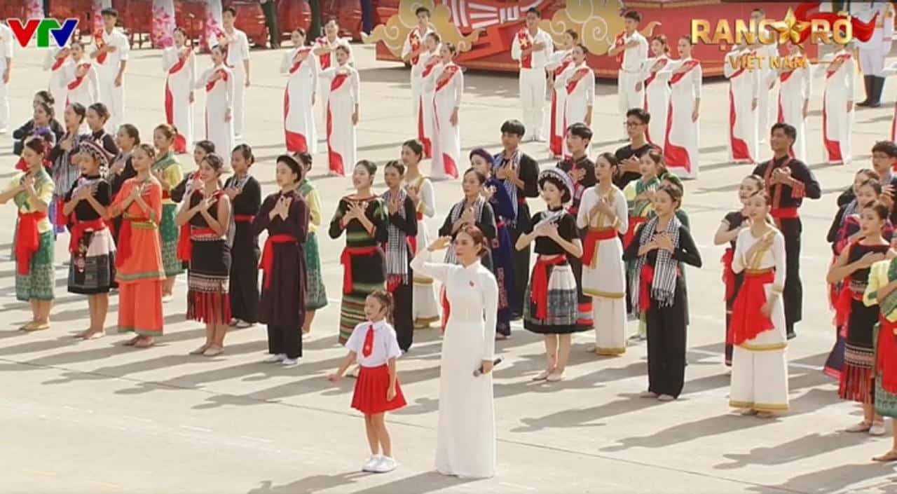 Ca sĩ Mỹ Tâm và bé Hà Thuỷ Tiên cùng biểu diễn tại Quảng trường Ba Đình sáng 2/9 (nguồn FBNV)