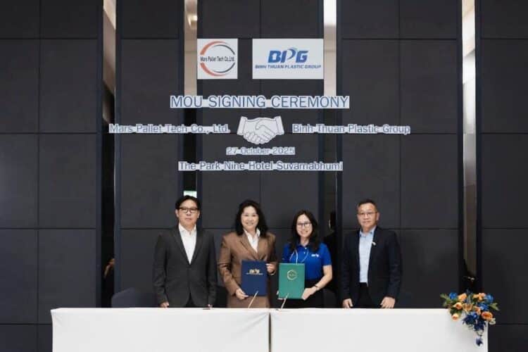 (VHCĐO) – Ngày 27/10/2025 mới đây, tại Khách sạn The Park Nine Suvarnabhumi (Thái Lan), Tập đoàn Nhựa Bình Thuận (BPG) và Mars Pallet Tech Co., Ltd (MARS) đã chính thức ký Biên bản Ghi nhớ (MOU) thành lập liên doanh BPG Mars Global Plastic (BMG) – đánh dấu bước tiến quan trọng trong việc phát triển giải pháp pallet và logistics toàn diện trên quy mô quốc tế.