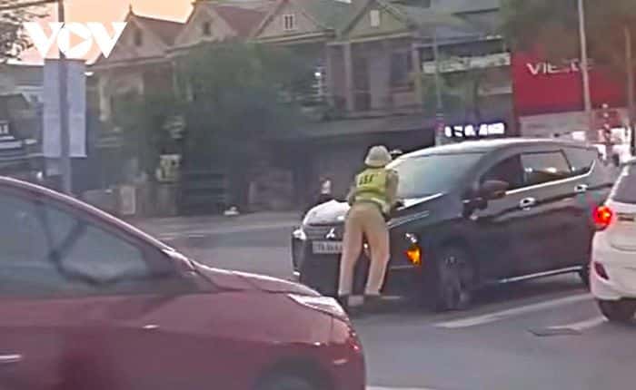 Cán bộ CSGT trên nắp capo xe ô tô. Ảnh: Cắt video